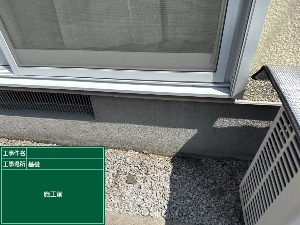 施工前は、基礎部分に汚れや細かなひび割れ(クラック)が見られ、劣化の進行が懸念される状態でした。