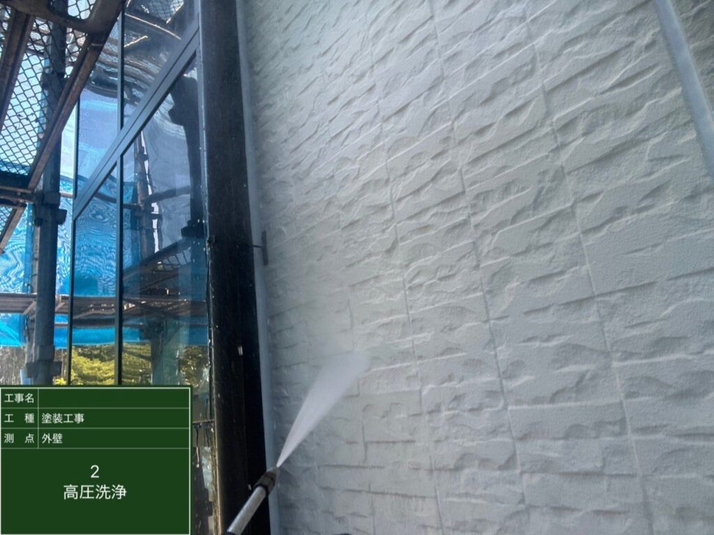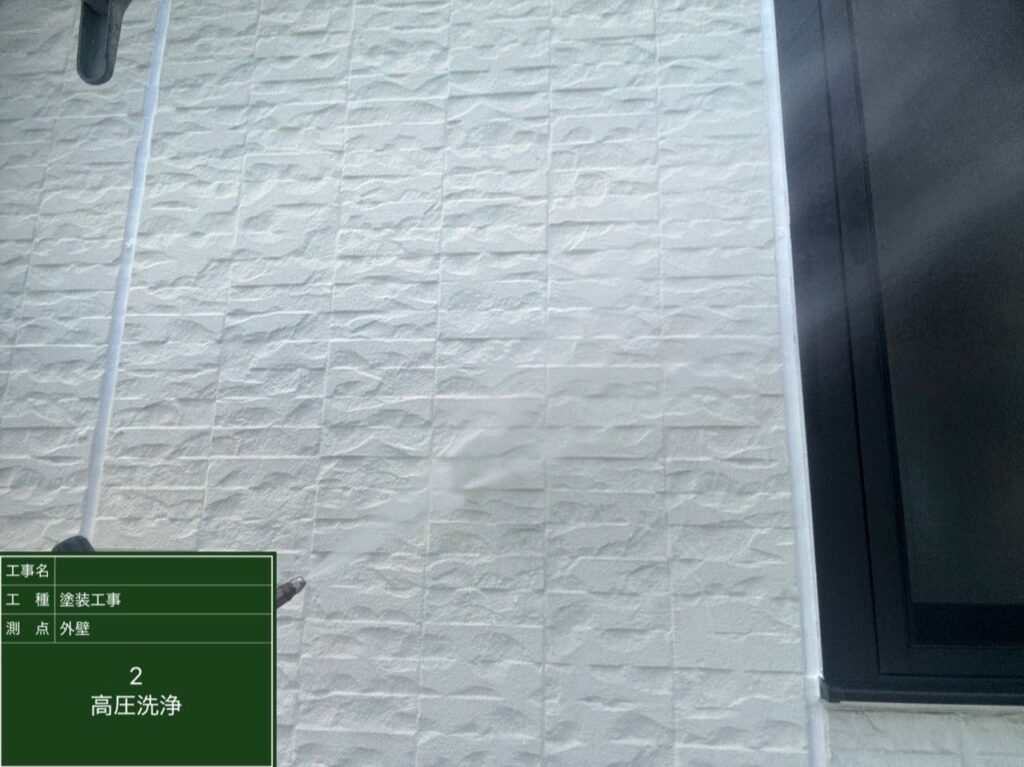 塗装前に高圧洗浄を行い、外壁に付着した汚れや古い塗膜、コケなどを丁寧に除去します。