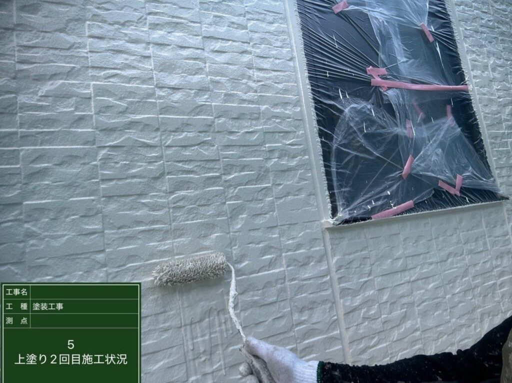 ローラーを使い、外壁の凹凸にしっかり塗料を含ませながら均一に塗装します。